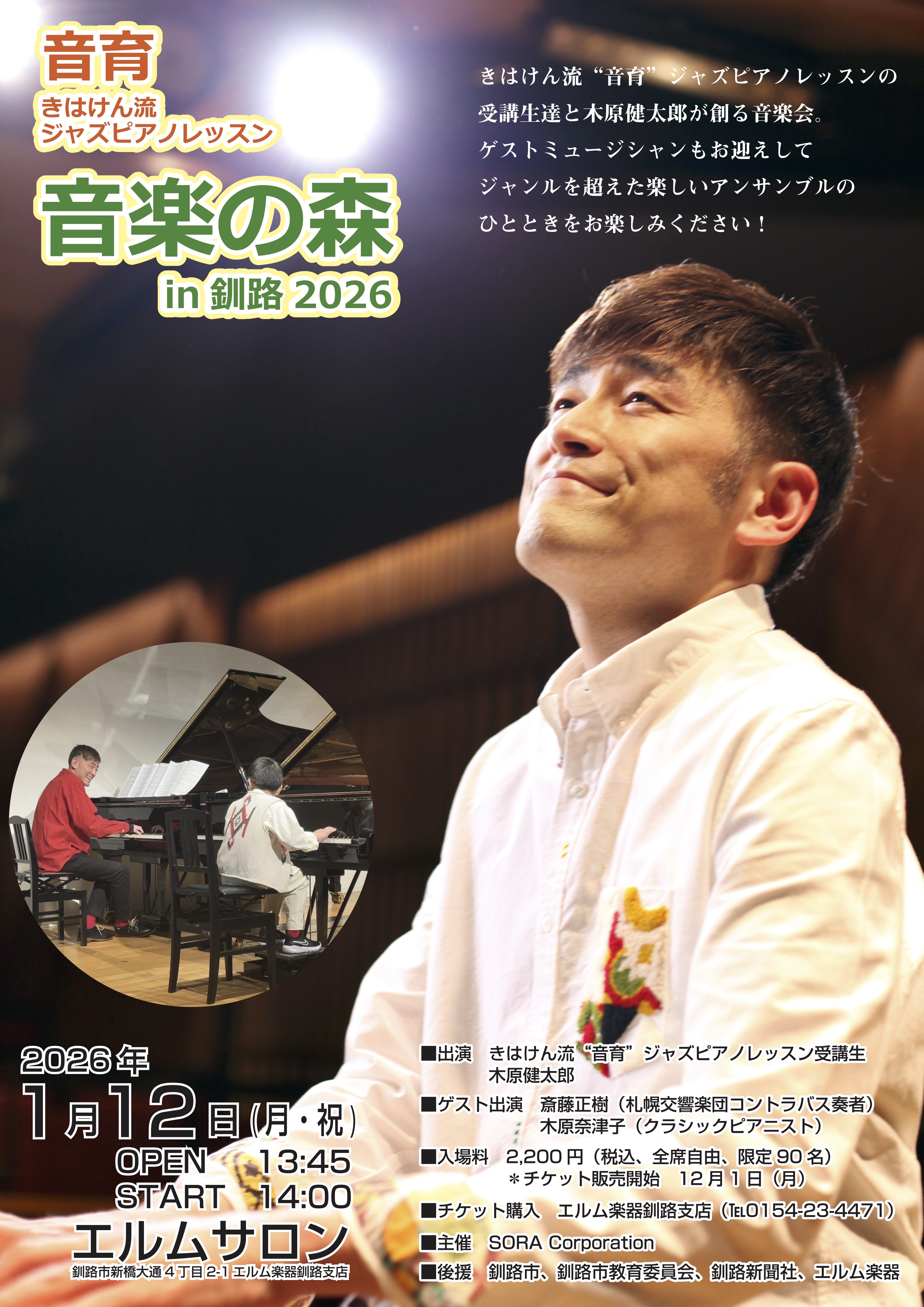 木原健太郎 ”音育”ジャズピアノレッスン受講生と 木原健太郎とゲスト音楽家で創る音楽会「音楽の森」今年も開催します。 まずは1/12(成人の日)の釧路公演からスタート。2月は2/15(日)に札幌公演がございます。チケット問い合わせはエルム楽器へ! 【釧路公演】 日程:2026年1月12日(月祝) 場所:エルム楽器釧路 サロンで14:00開演です! 受講生さんたちの熱演~ 釧路公演はジャズ、シャンソン、髭男ジャズアレンジからボカロジャズアレンジ等、 ジャンル様々です~!この曲がこんなアレンジに!も楽しみのひとつ。 ゲスト演奏家に コントラバス:斎藤正樹、 クラシックピアノ:木原奈津子 をお迎えして楽しく音遊び♪ チケット:2,200円(税込、全席自由) →釧路公演は限定90名です! チケットはエルム楽器釧路で販売中。 お問合せはエルム楽器釧路まで。 電話:0154-23-4471 メール:(メール問い合わせは1月8日 木曜まで) kushiro ★ elm-t.co.jp ★マークを@に変えて送信してください。 【札幌公演】 日程:2026年2月15日(日) 場所:エルムホール(エルム楽器本店内)で14:00開演です! 演目は ミュージカルの名曲からディズニー楽曲、ジャズスタンダード等々、 盛りだくさんに! チケット:一般1,500円、学生1,000円(税込、全席自由) 札幌公演のチケット販売は2026年1月5日(月)から。 ゲスト演奏家に コントラバス:斎藤正樹、 クラシックピアノ:木原奈津子をお迎えして楽しく音遊び♪ お問合せはエルム楽器本社まで。 電話:011-350-1111 メール: elmh★elm-t.co.jp ★マークを@に変えて送信してください。